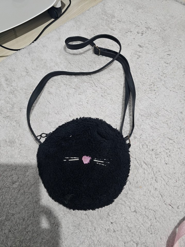 Pembe burun ve bıyıklı kedi yüzü desenli siyah peluş çanta. Ayarlanabilir askısı ile taşımaya uygundur.