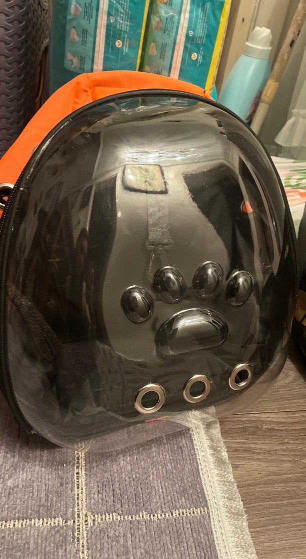 Parlak yüzeyli, pati şeklinde havalandırma delikleri olan siyah evcil hayvan taşıma çantası. Kedi ve küçük köpekler için uygundur.