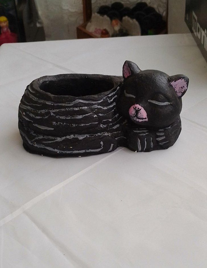 Uyuyan kedi şeklinde siyah saksı, detaylı dokusu ve sevimli tasarımıyla ortama hoş bir hava katar.