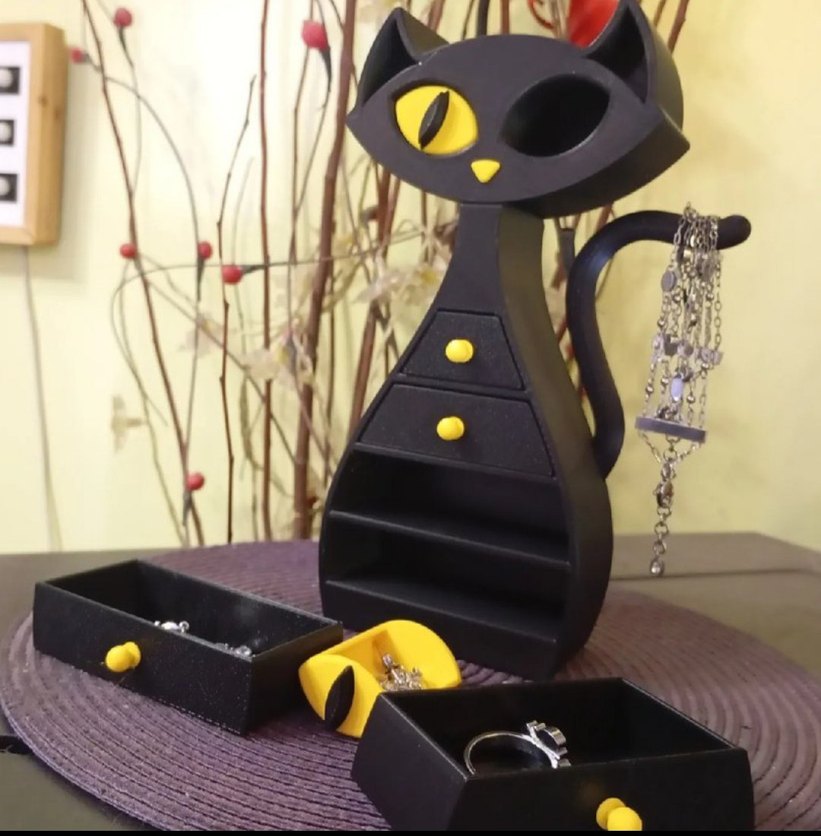 Siyah kedi şeklinde, canlı sarı detaylı ve takılar için çok bölmeli kutu.