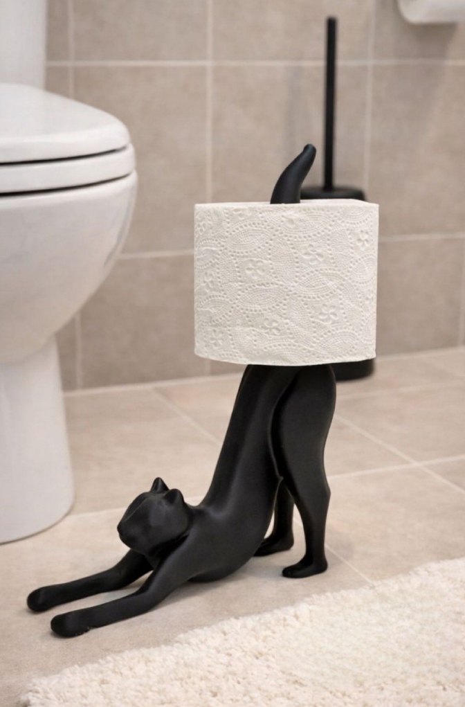 Siyah renkte, esneyen kedi figürlü tuvalet kağıdı tutucudur. Kuyruğunda tuvalet kağıdı yer alır ve banyo dekoruna eğlenceli bir dokunuş katar.