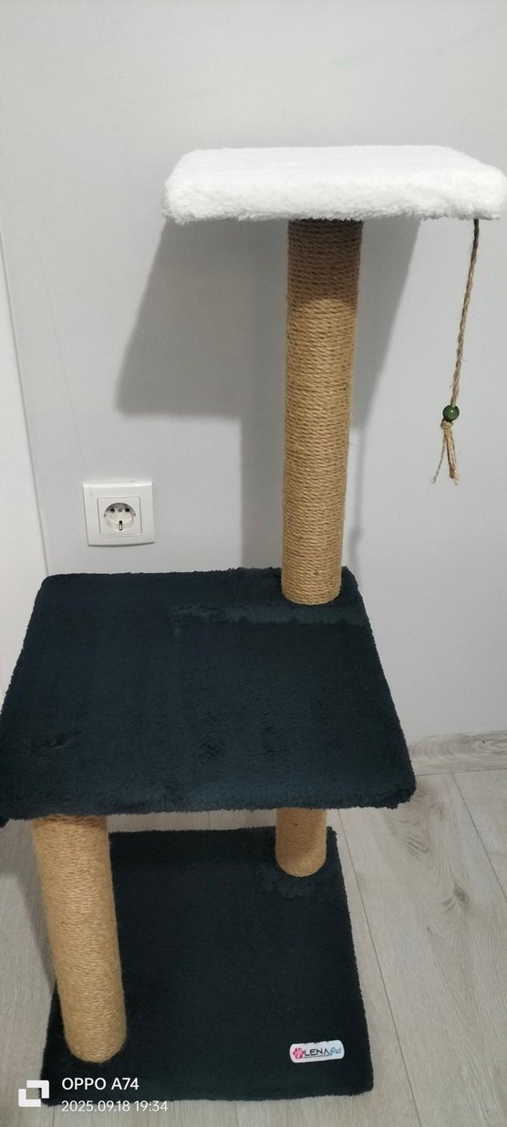 Yumuşak kumaş kaplı platformlar ve doğal ip sarılı direkleri olan siyah kedi tırmalama tahtası .