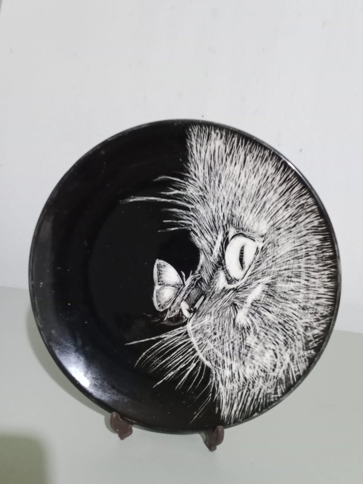 Koyu siyah zemin üzerinde beyaz çizgilerle kedi yüzü ve kelebek figürü bulunan dekoratif tabak.