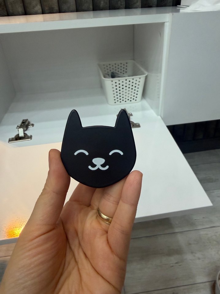 Küçük, siyah kedi yüzü şeklinde, sade ve sevimli tasarıma sahip bir kedi aksesuarıdır. Kompakt boyutuyla kolayca tutulur ve saklanır.