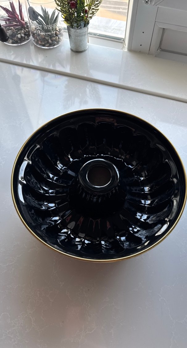 Parlak siyah yüzeyli, halka şeklinde kekler için uygun, oluklu tasarımlı koyu siyah kek kalıbı. Hiçbir kusuru yok ihtiyaç fazlası