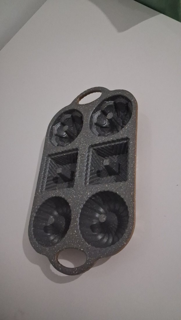 Altı farklı şekilli siyah kek kalıbı, sağlam malzemeden üretilmiş ve taşıma kolaylığı için kulplu.