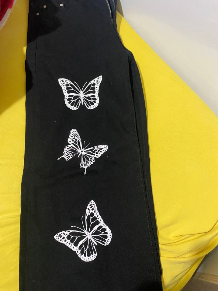 Siyah Kelebek Baskılı Bol Kesim Kadın Jean