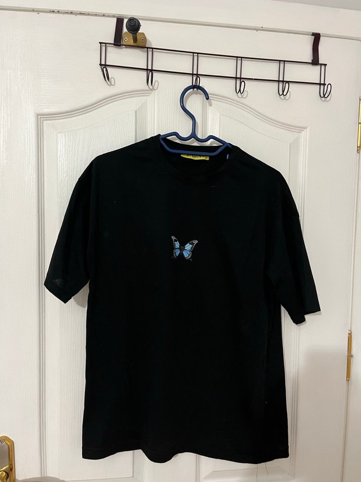 Siyah denim kumaştan, kısa kollu, bol kesim ve bisiklet yaka tişört. Önünde küçük kelebek baskısı ile minimal sokak stili.