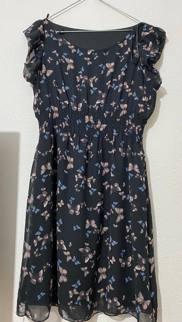 Siyah kelebek desenli midi elbise, straplez yaka ve fırfır detaylıdır. Kolsuz ve bol kesimdir, trend casual tarz için uygundur.