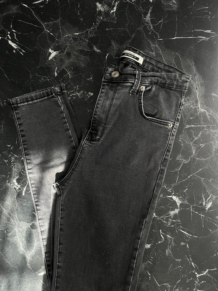 Siyah, kemer detaylı dar kesim jean pantolon, midi boyda, günlük kullanıma uygun şık bir sokak stili ürünü.
