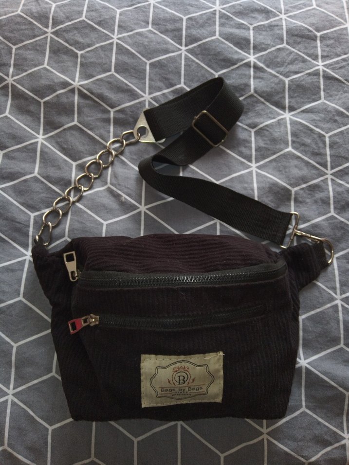 Siyah renkli, kemer detaylı ve zincirli bel çantası. Sentetik kumaştan üretilmiş, grunge punk tarzına uygun şık bir tasarım.