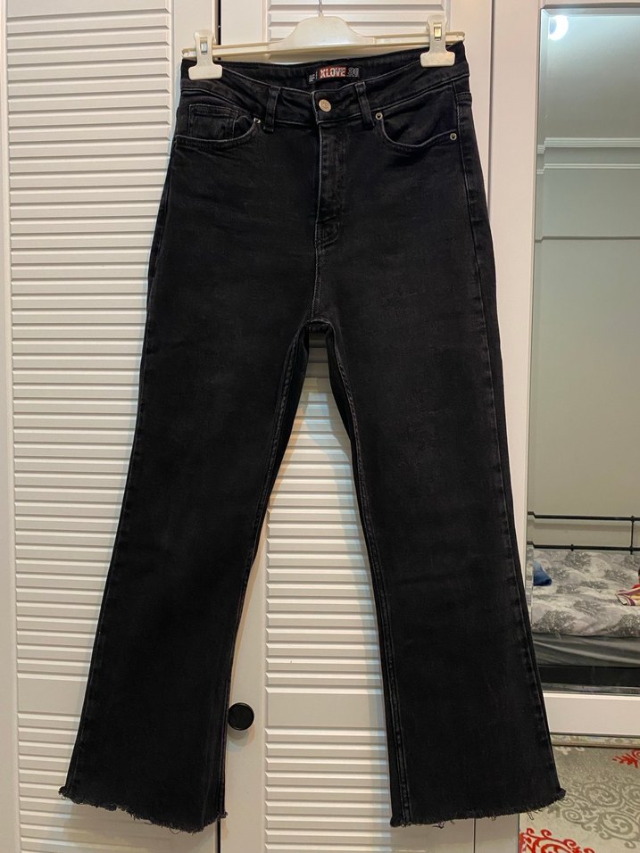 Siyah kot kumaştan, kemer detaylı, regular fit kadın jean. Günlük kullanıma uygun sokak stili için ideal. Kesik ispanyol paçalıdır. Temiz kullanıldı bir kusuru yoktur. Ürün boyu 95 cm’dir.