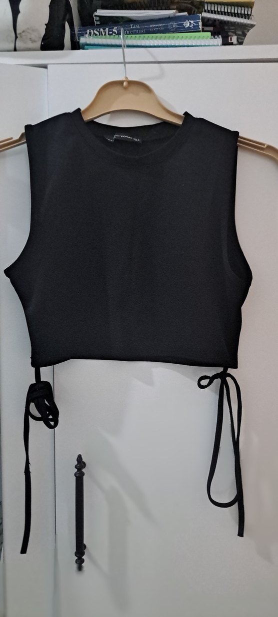 Kemer detaylı, kolsuz siyah crop top. Yumuşak sentetik kumaştan, sokak stili ve dış mekan kullanımı için uygun.