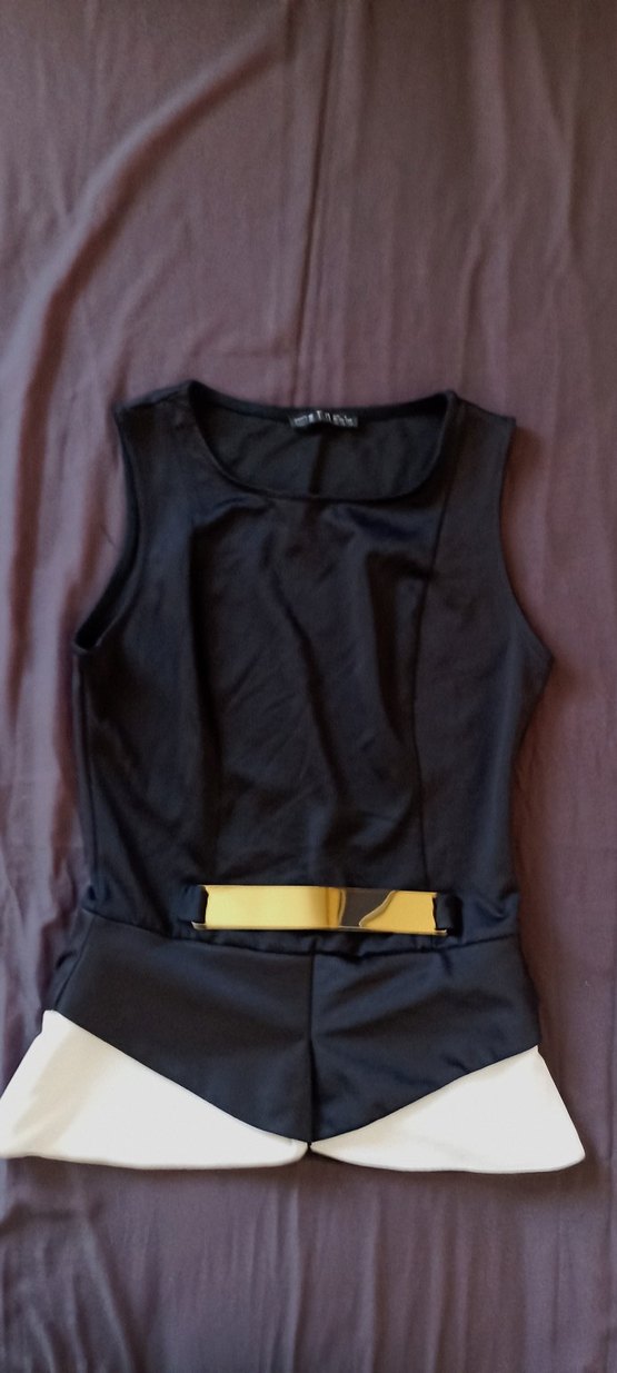 Siyah, kolsuz, bel kemerli ve V yakalı kadın üst İpeksi kumaş ve midi boy ile gündelik kullanıma elverişli. ✨