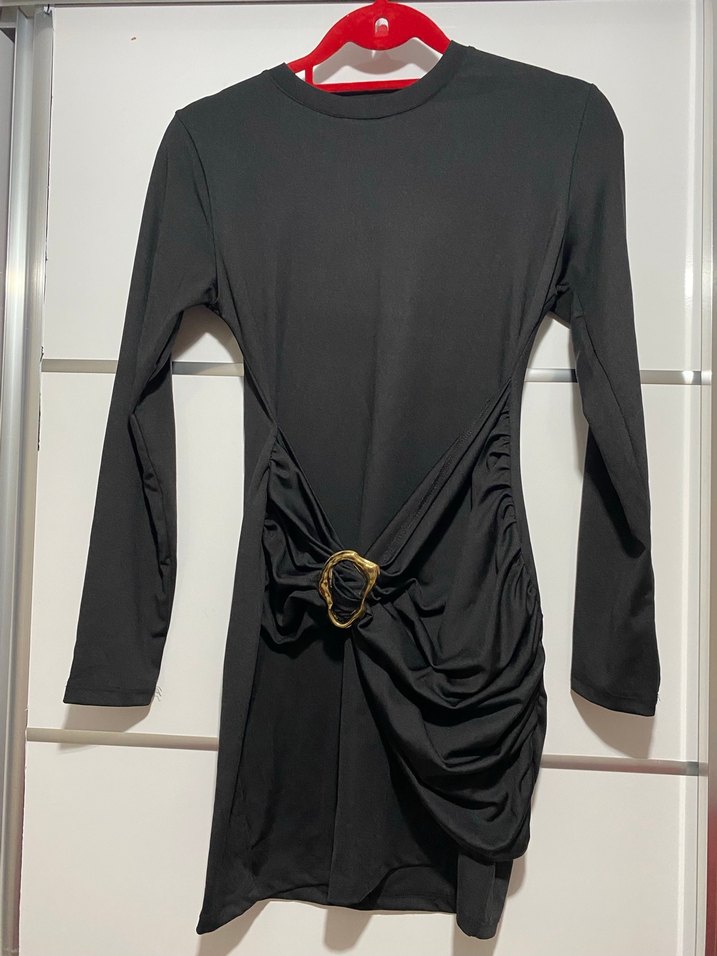 Siyah, uzun kollu, kemerli ve tokalı bel detaylı, mini boy, dar kesim elbise. Cesur ve avangard tarzıyla romantik akşamlar için uygun.