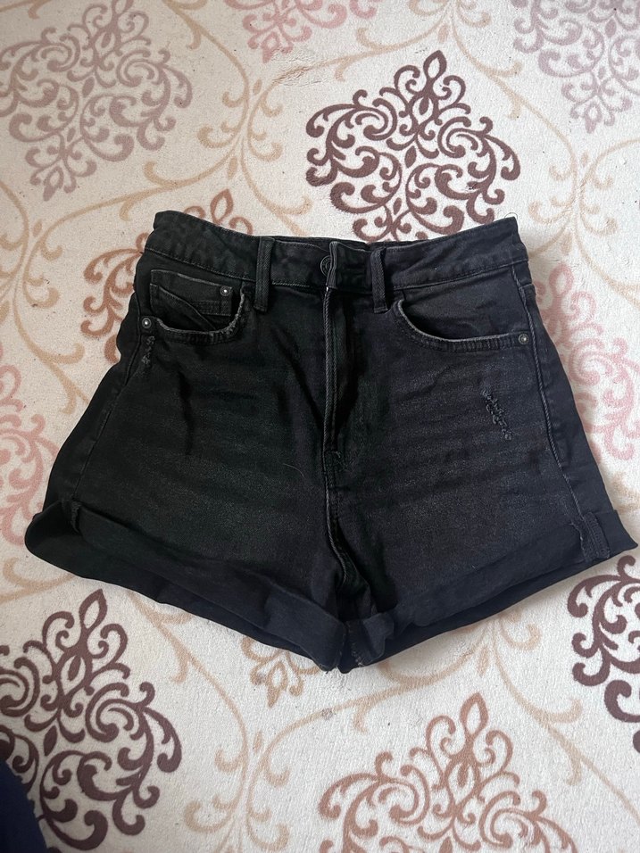 Siyah renkte, kemer detaylı mini kot şort. Günlük ve sokak stiline uygun sade tasarım.