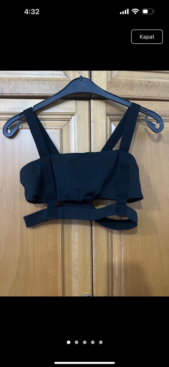 Siyah renkli, kemer detaylı, askılı ve halter yaka bustiyer. Sentetik kumaştan, kısa ve vücuda oturan kesimde, goth ve athleisure tarzına uygun.