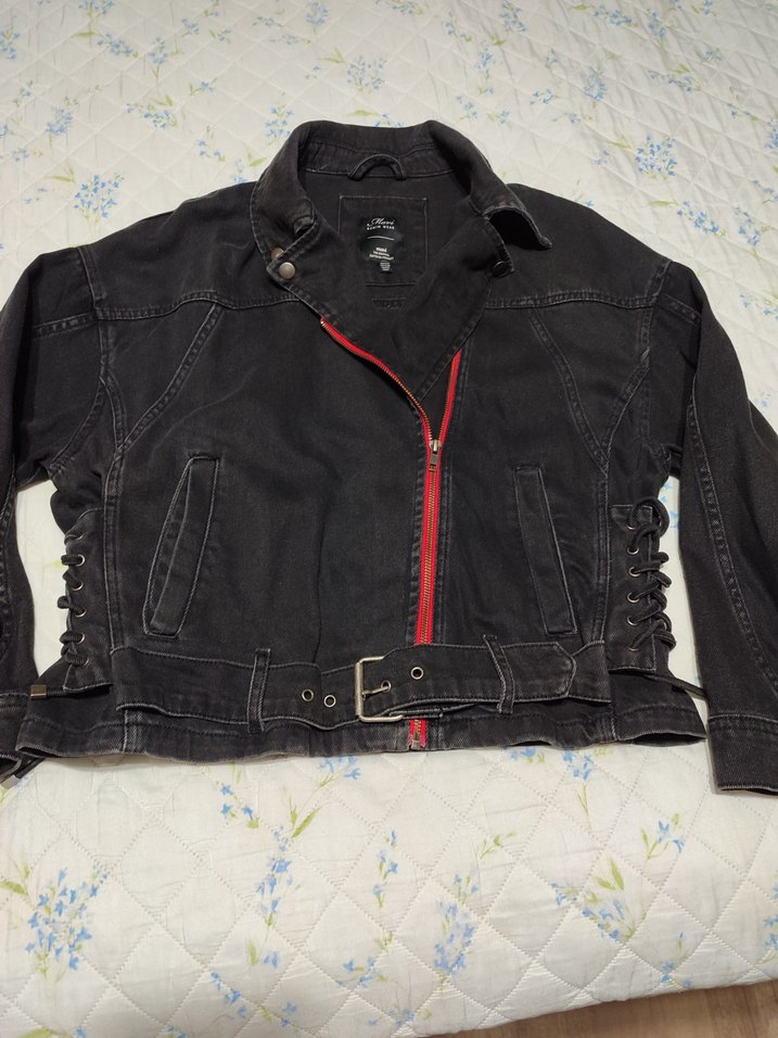 Bu siyah kemerli biker denim ceket, yaka detaylı, bant kollu ve fitted kesimdir, günlük kullanıma uygun koyu grunge punk tarzını yansıtır.