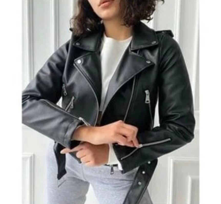 Siyah renkli, kemerli ve fermuarlı kollu, normal boy fitted biker deri ceket. Sokak stiline uygun şık bir parça.