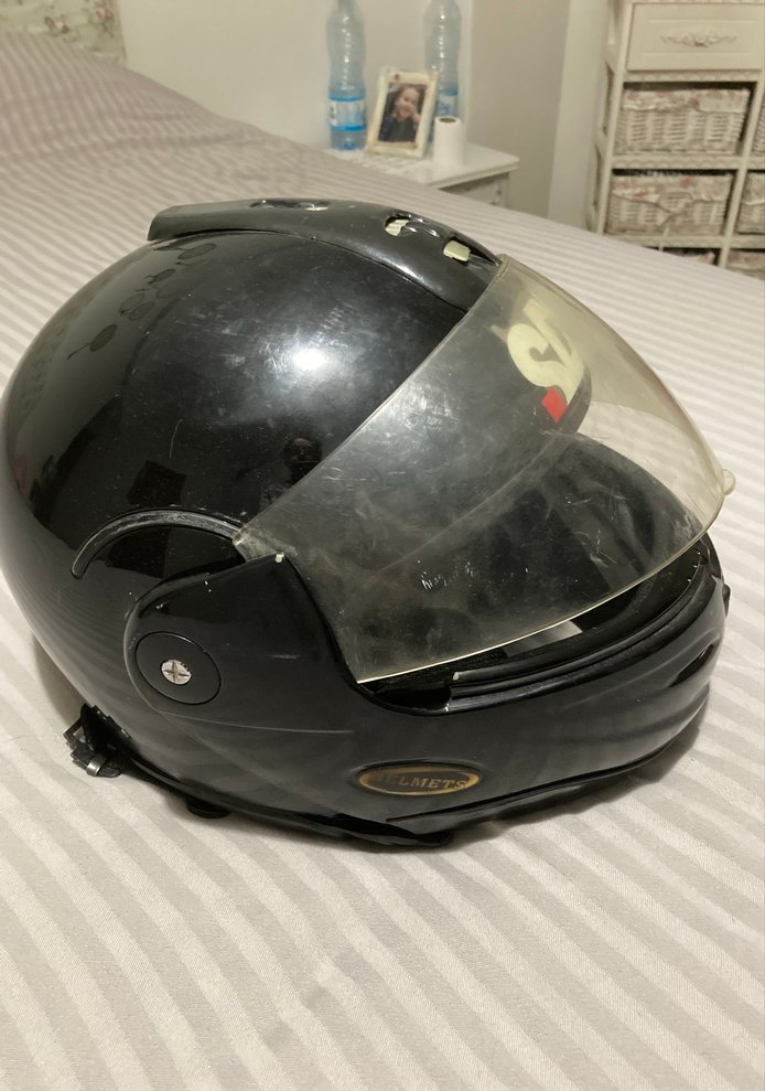 Siyah renkli, kemerli kayışa sahip plastik motosiklet kaskı. Şeffaf vizörlü, hafif bir çatlak var