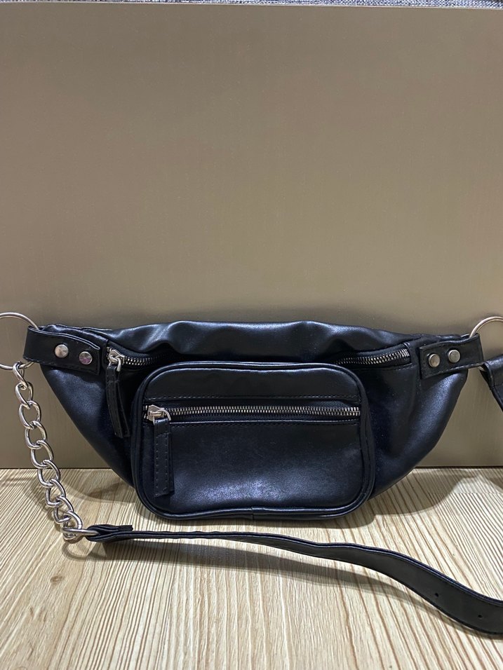 Siyah renkte, kemerli ve biker tarzında minimalist kadın bel çantası. Önünde fermuarlı küçük cep ve zincir detayları bulunur.