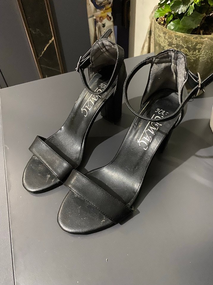 Siyah blok topuklu kadın ayakkabısı, kemerli ve hafif yılan desenli, cesur gotik tarz ve romantik akşamlar için uygundur.