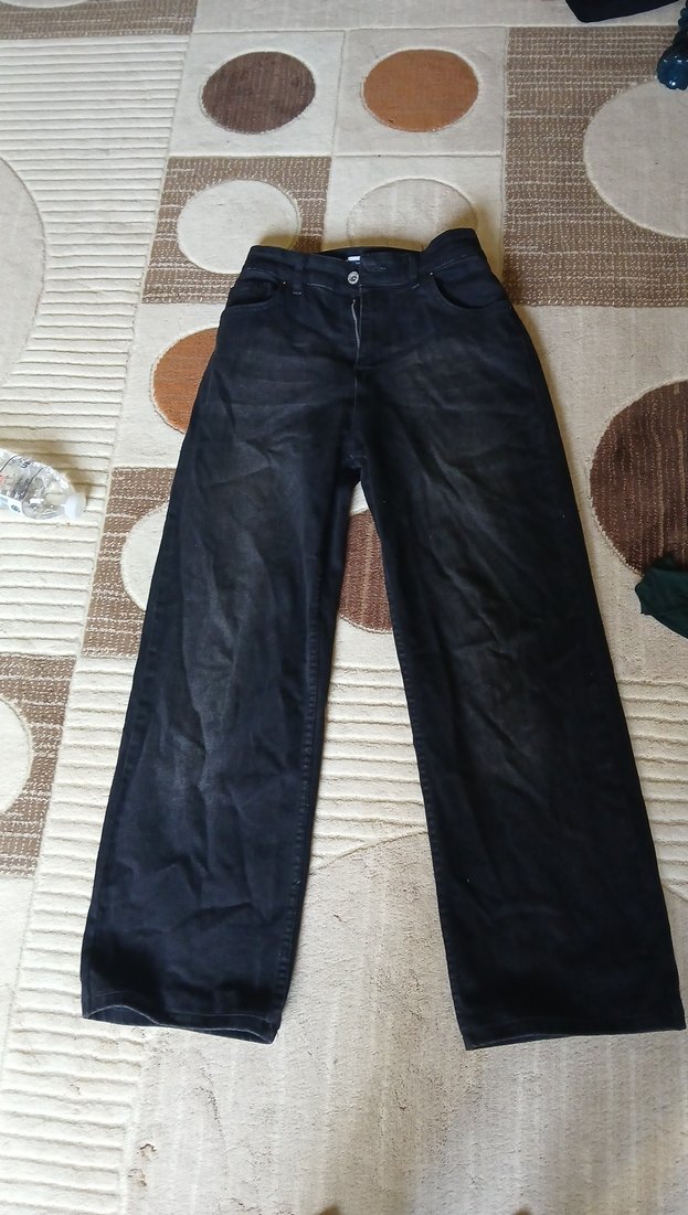 Siyah renkte, kemerli bol kesim kadın kot pantolon. Midi boyda, sokak stiliyle günlük kullanıma uygun. Sadece 2 defa giyilmiş