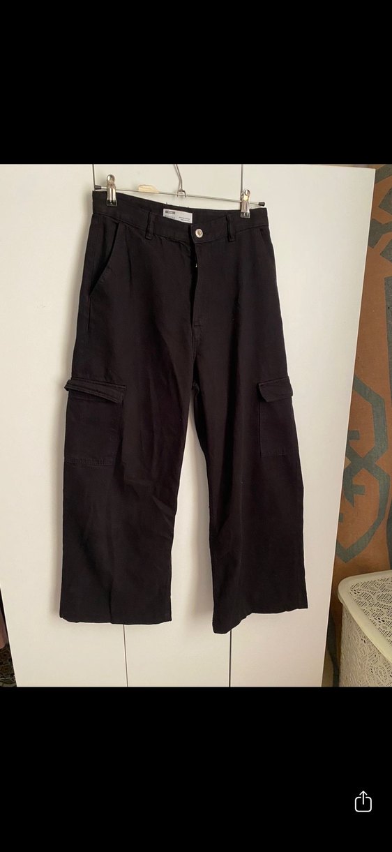 Siyah kot kumaşından yapılmış, bol kesim ve kemerli pantolon. Günlük kullanıma uygun, desensiz ve rahat bir sokak stili sunar.