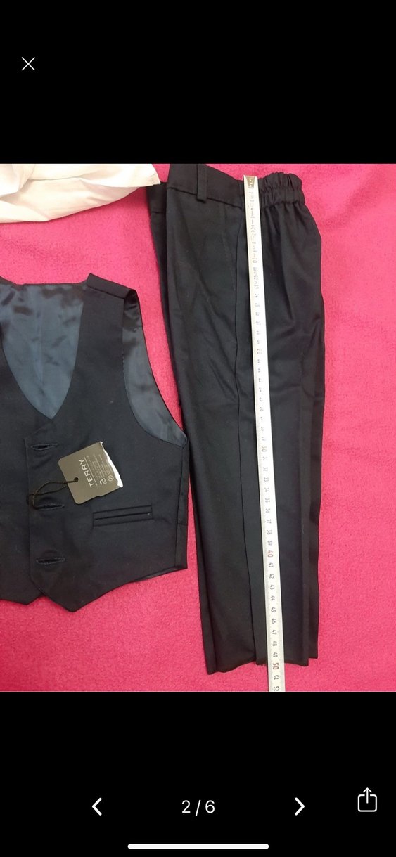 Siyah renkli, kemerli pantolon ve kesimli yaka detaylı kolsuz yelekten oluşan, düz ve normal kesim çocuk takım elbisesi. Gömleği kendım ekledim. Fondöten gibi bir leke var extra deneyip çıkarmadım. Normalde ikili aldım. İade kabul etmiyorum. 8 ay 1 yaş arası için.