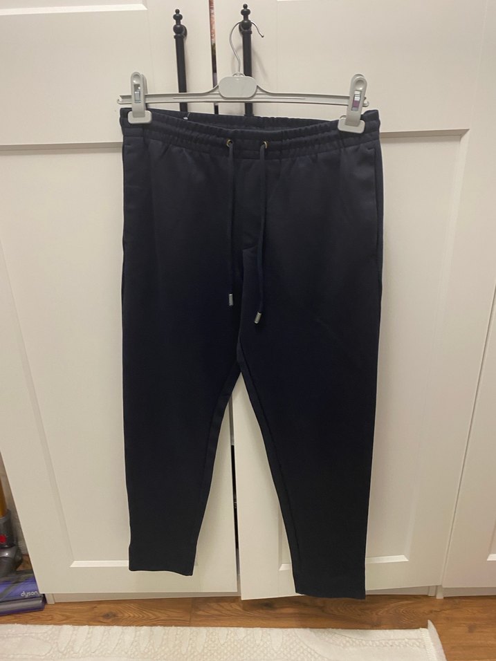 Siyah, kemerli, dar kesim erkek eşofman altı, sentetik kumaştan, günlük şık rahat stil için uygun. Ürün lacivert rengide vardır