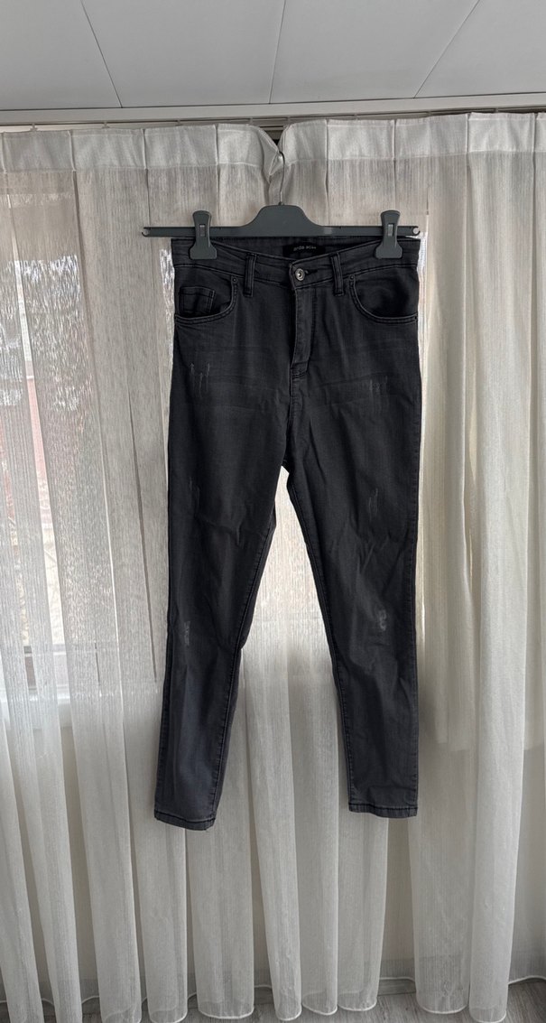 Siyah renkte, kemerli ve dar kesim normal boy kot pantolon. Günlük sokak stiline uygun, desen içermeyen şık bir tasarım.