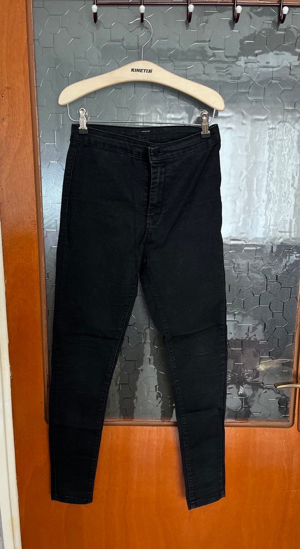 Kemerli bel ve dar kesime sahip siyah kot pantolon, normal boyda. Desensiz ve günlük kullanıma uygun şık sokak stili parçası.