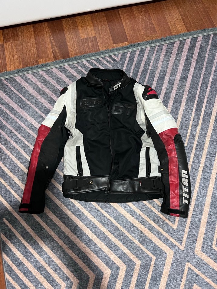 Bu siyah, beyaz ve kırmızı panelli, kemerli ve dar kesim deri biker ceket, uzun kollu ve yaka detaylıdır. Günlük kullanıma uygun midi boyda bir sokak stili görünümü sunar.