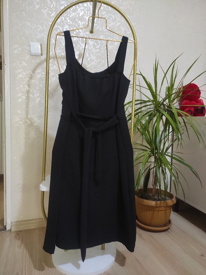 Bu siyah midi boy elbise, kalın askılı ve kemerli bel detayıyla dikkat çeker. Nefes alan ayrobin yumuşacık kumaştan, klasik gotik tarzda, günlük kullanıma uygun rahat kesimdir.