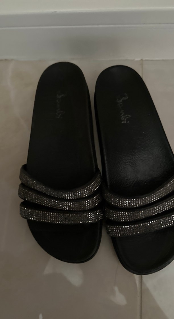 Siyah, kemerli bantlara sahip dolgu topuk kadın terlikleri. Minimalist tasarımıyla günlük kullanıma uygun, rahat ve şık bir model. Kullanıldı içinde birazcık deforme var o yüzden makul fiyata koydum