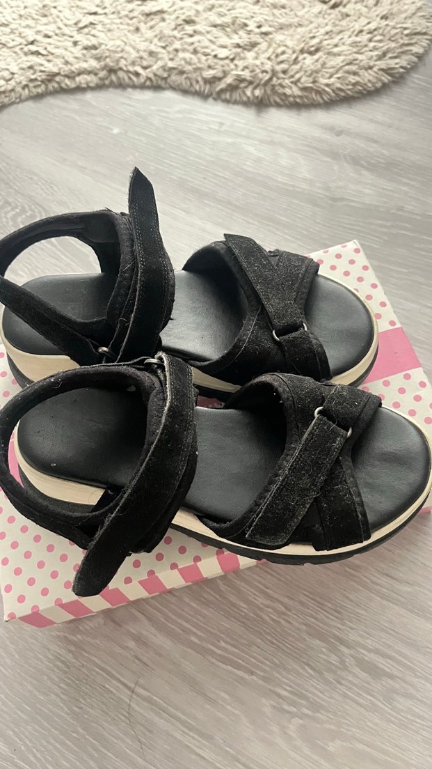 Siyah renkte, kemerli bantları ve kauçuk tabanlı dolgu topuklu kadın sandalet. Minimalist ve günlük sokak stili için uygun.
