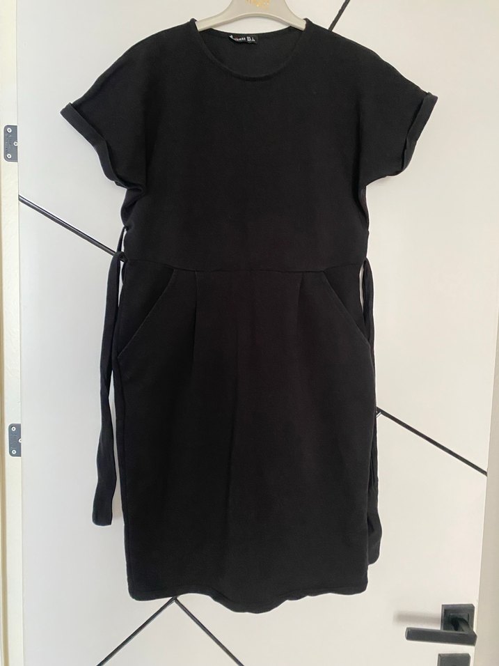 Kısa kollu, bisiklet yaka siyah rahat kumaş midi elbise, kemerli ve bol kesimdir. Günlük kullanıma uygundur.