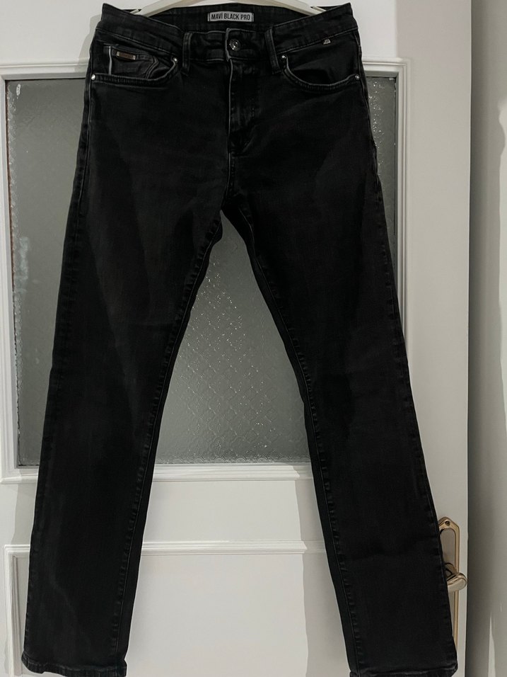 Siyah denim kumaştan, kemerli ve normal boyda, regular fit erkek jean. Desensiz ve günlük kullanıma uygun.