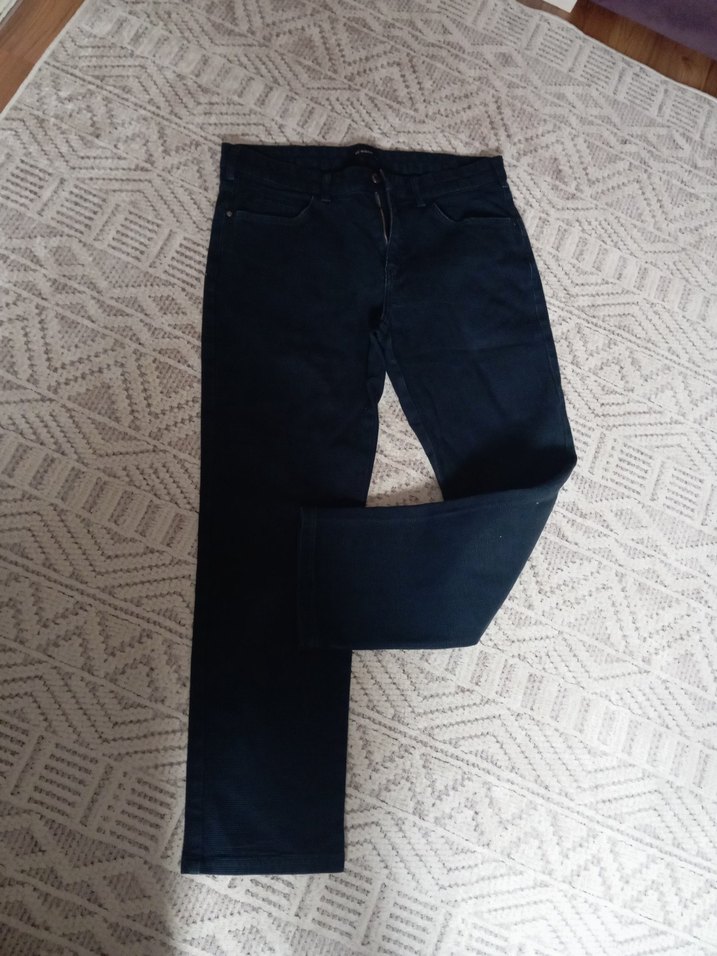 Siyah kemerli, normal boyda, regular fit denim pantolon. Günlük kullanıma uygun, rahat ve şık bir sokak stili parçası.