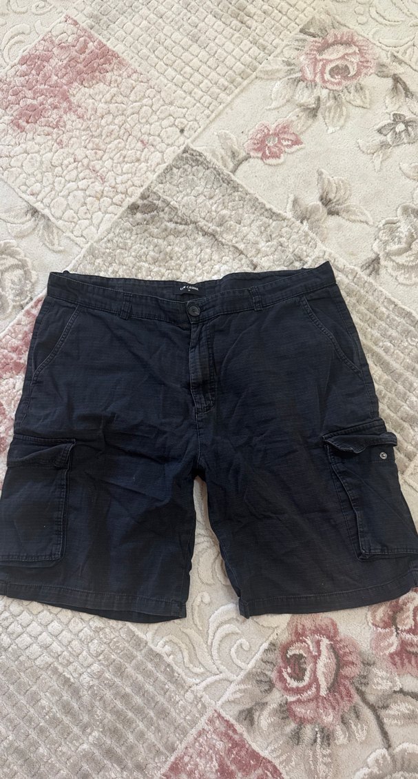 Siyah denim kumaştan, kemerli ve bol kesim erkek kargo şort. Kısa boylu ve desensiz, günlük sokak stili ve açık hava kullanımına uygun.