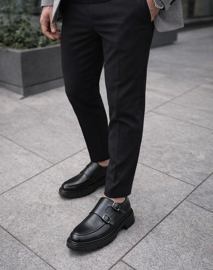 Siyah, kemerli, orta boy erkek pantolonu. Düz, rahat kesim ve yumuşak kauçuk malzemeden üretilmiştir. Ofis ve sokak stiline uygundur. #erkekayakkabı#erkek