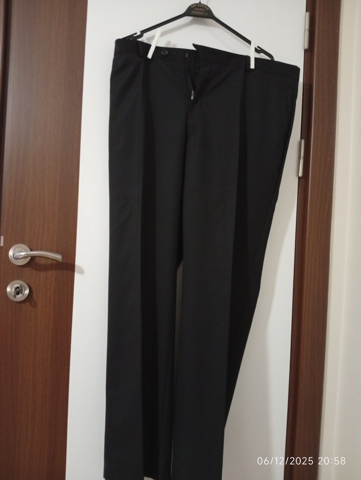 Düz siyah, kemerli erkek pantolon. Normal boy ve regular fit, ofis kullanımı için uygun, sentetik kumaştan yapılmıştır. bel 55 boy 112cm