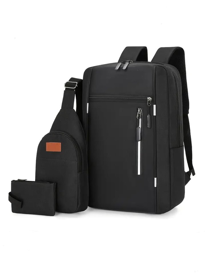 Kemerli siyah erkek sırt çantası seti; büyük sırt çantası, çapraz çanta ve küçük kese içerir. Desensiz, iş ve sokak stiline uygun.