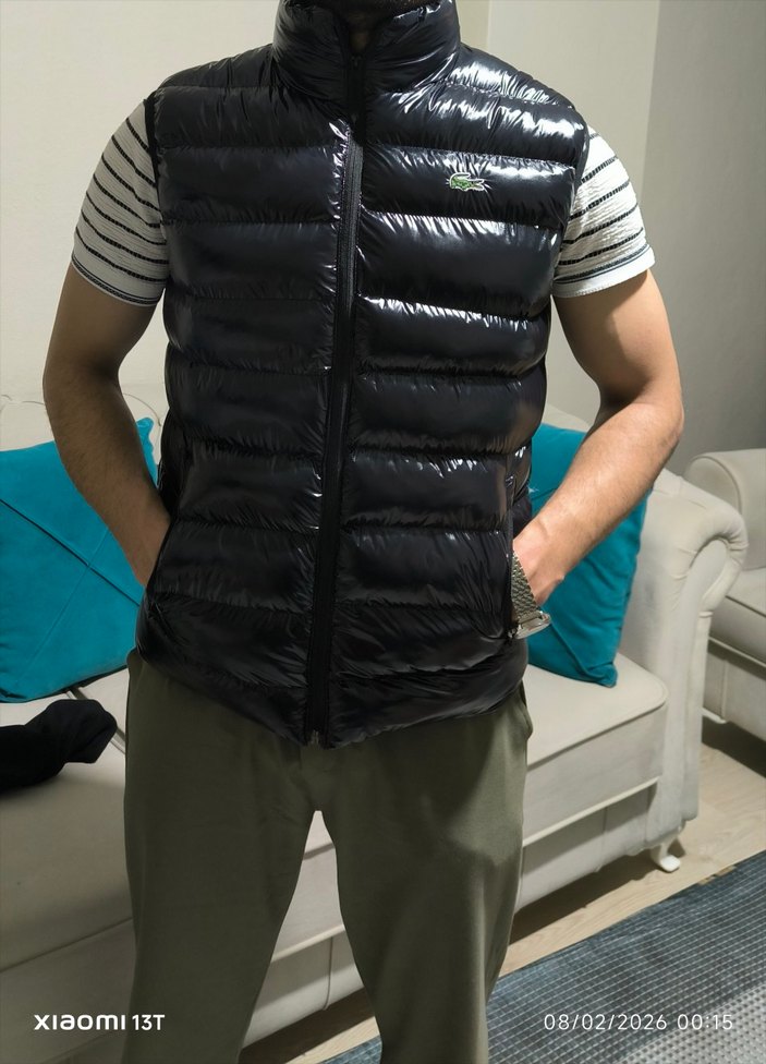 Siyah kemerli, yüksek yakalı, vücuda oturan midi uzunlukta erkek şişme yelek. Parlak sentetik kumaştan, günlük ve sokak stiline uygun.