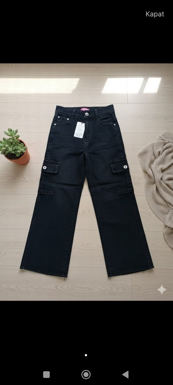 Siyah kot kumaştan, kemerli ve geniş paçalı kadın pantolon. Orta boy uzunlukta, cep detaylı, günlük sokak stili için uygun. 8/9/10/11/12 yaşları mevcut.