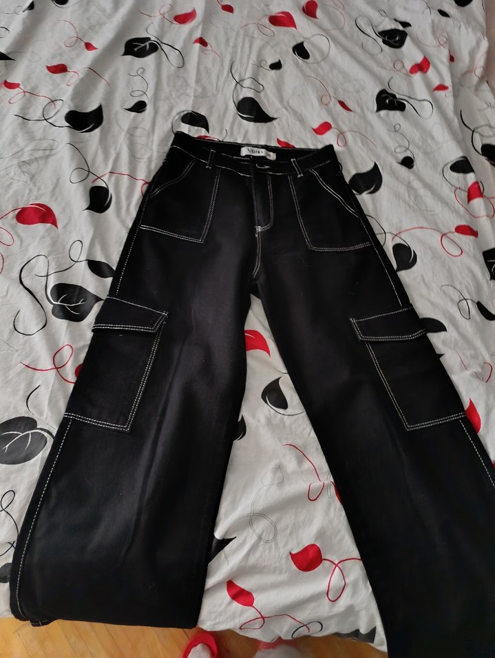 Siyah kot pantolon, geniş kesim ve kemerli, midi boy, çoklu ceplerle sokak stiline uygun.