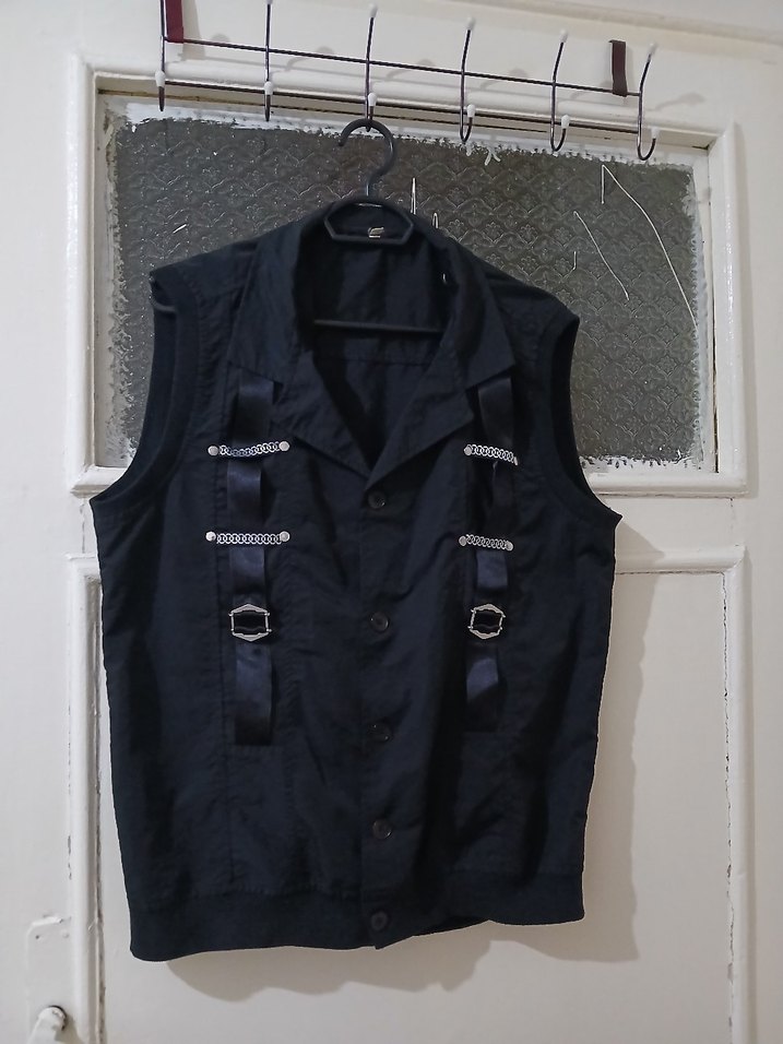 boyu 68 cm, iki kol arası 54 cmdir. Siyah kemerli, kolsuz, normal boyda notched lapel yakalı gotik tarzda, günlük kullanıma uygun dar kesim kadın yelek. #yelek #sporyelek #günlükyelek