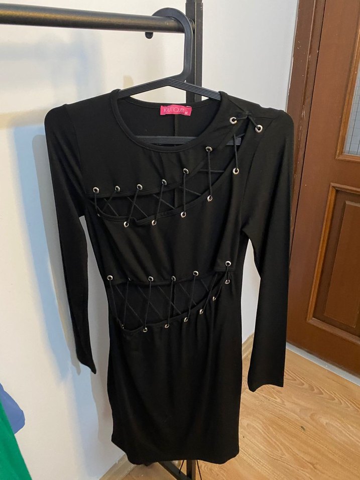 Kemer detaylı, yuvarlak yakalı, uzun kollu siyah dar kesim elbise. Gotik tarzda bağcıklı ve desenli tasarım içerir.