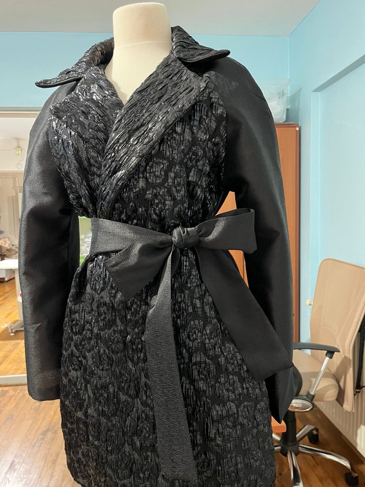 Siyah, kemerli ve uzun kollu hamile kabanı, sentetik kumaştan yapılmış, regular fit ve ofis kullanımı için uygundur. Gotik tarzda, yakası kesik yakalıdır.