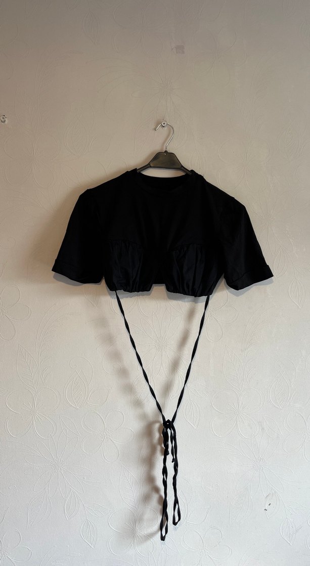 Kızlar için siyah renkli, keten kumaştan bolero. Halter yaka ve askılı kollara sahip, bol kesim ve kemerli tasarımıyla öne çıkar.